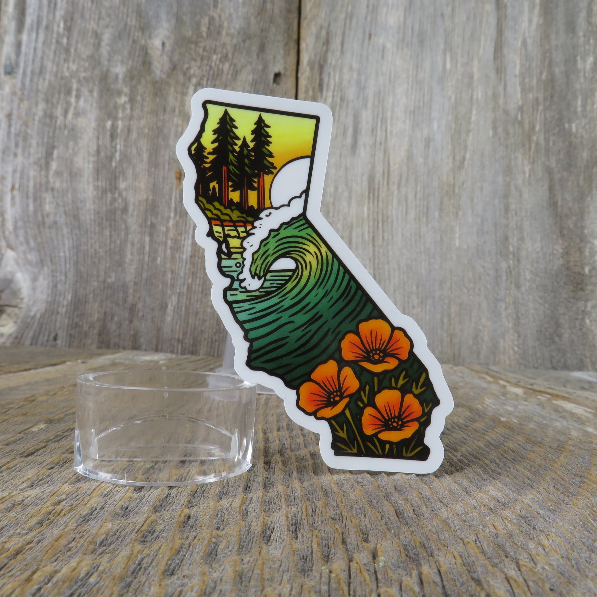 California State Shaped Sticker Redwood Trees Coastal Waves Poppy State Flower