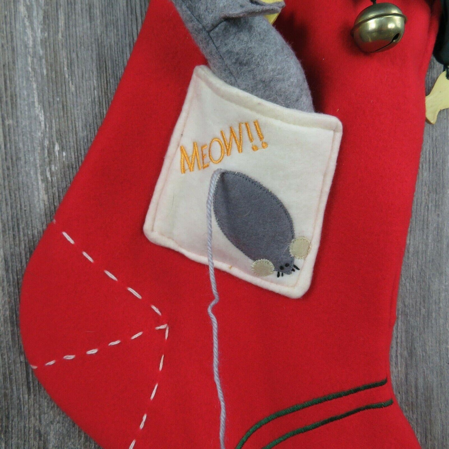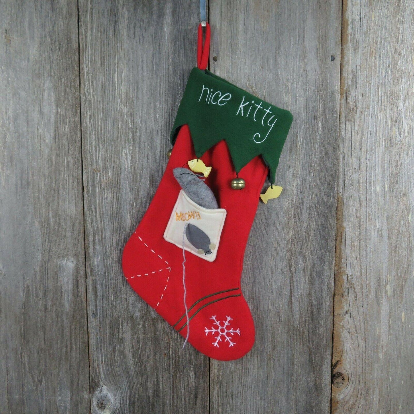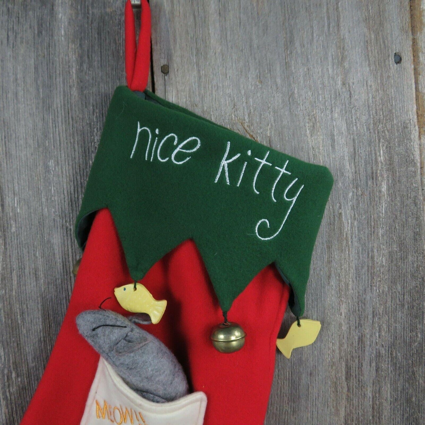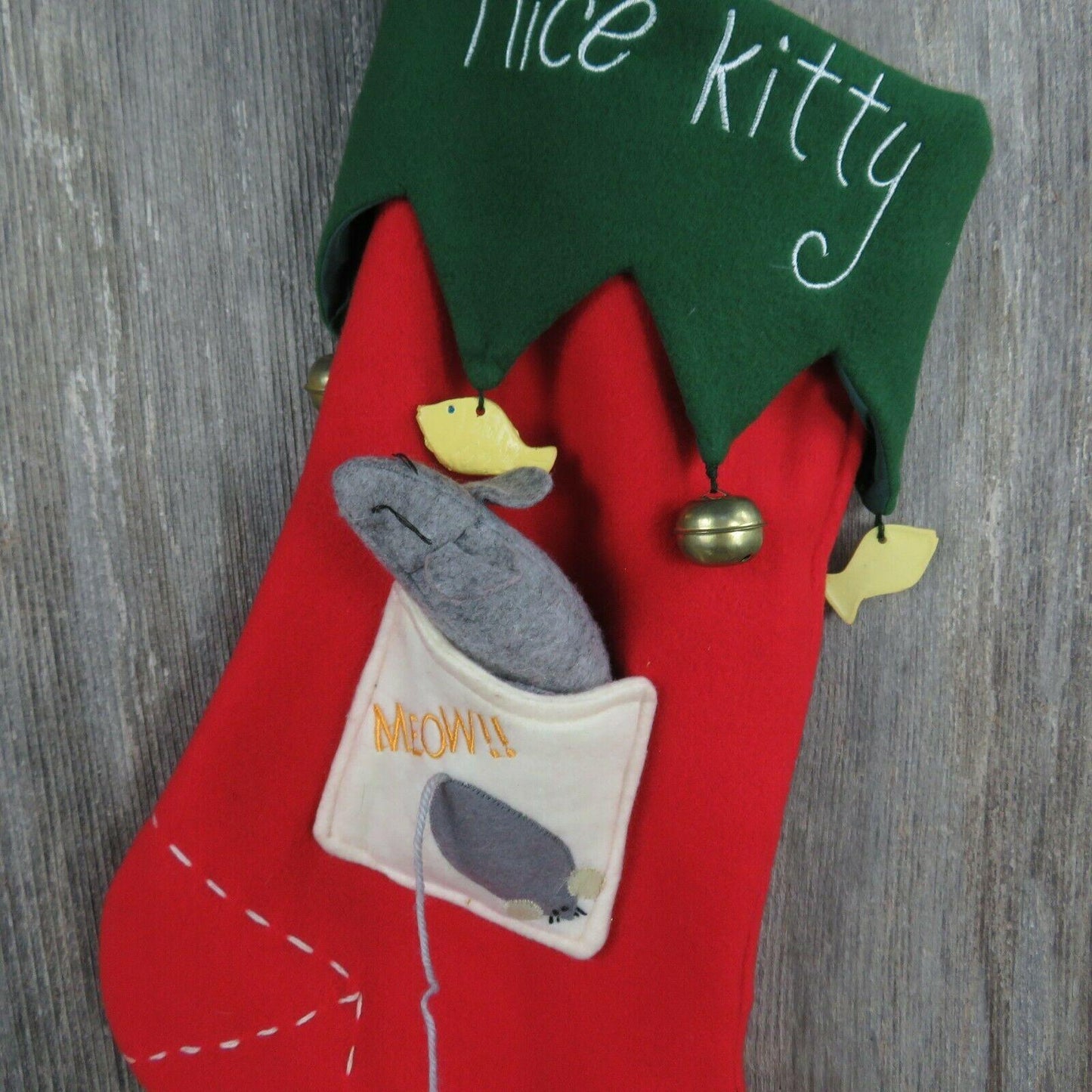 Nice Kitty Christmas Stocking Cat Mouse Fish Bells Fleece Green Red Pet