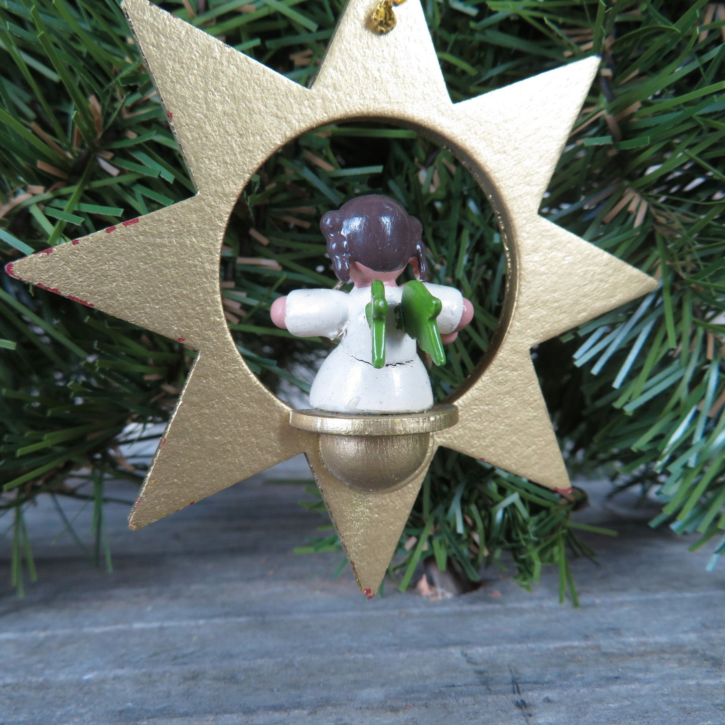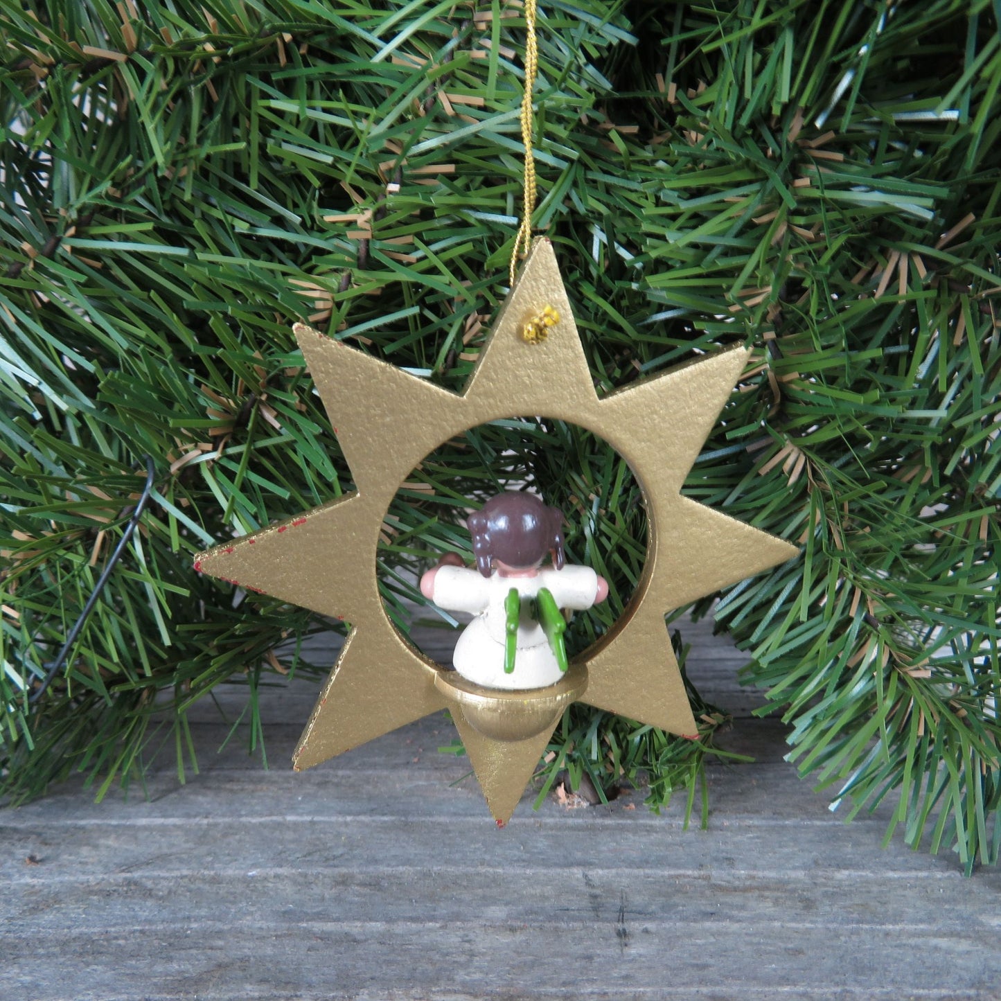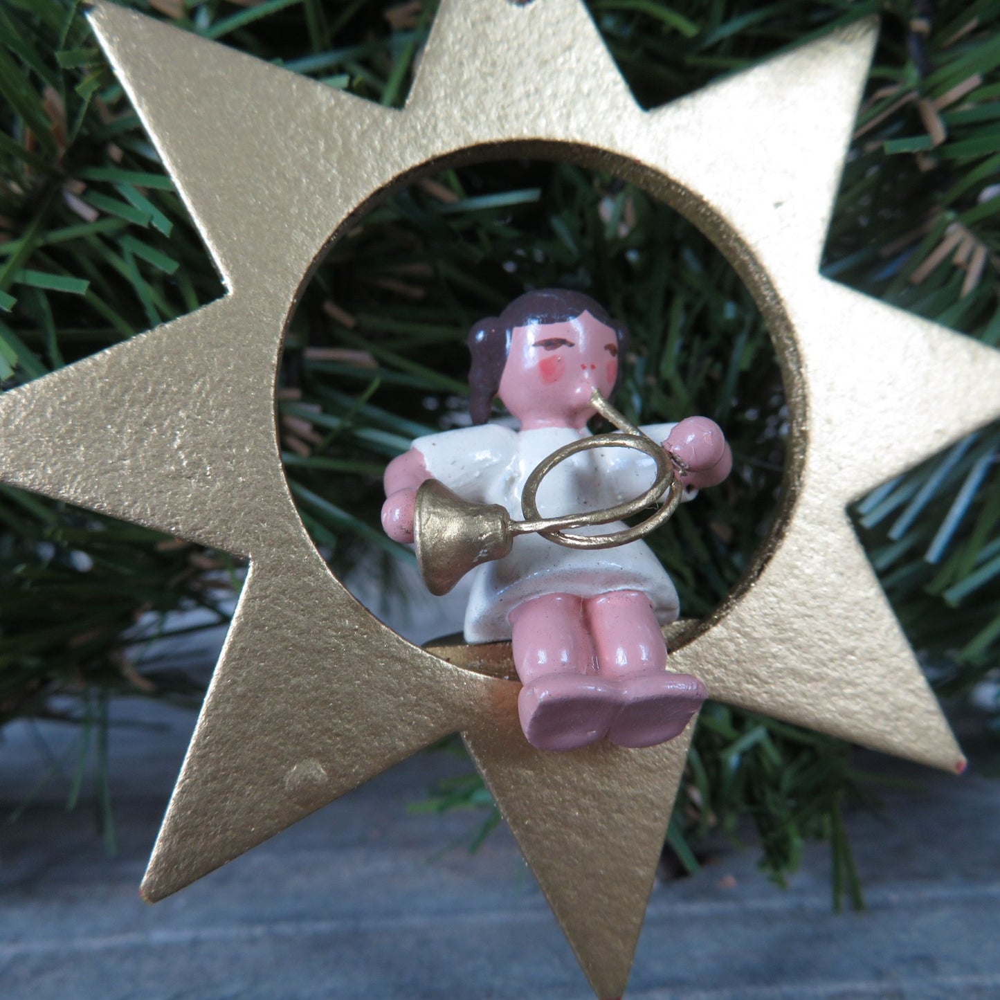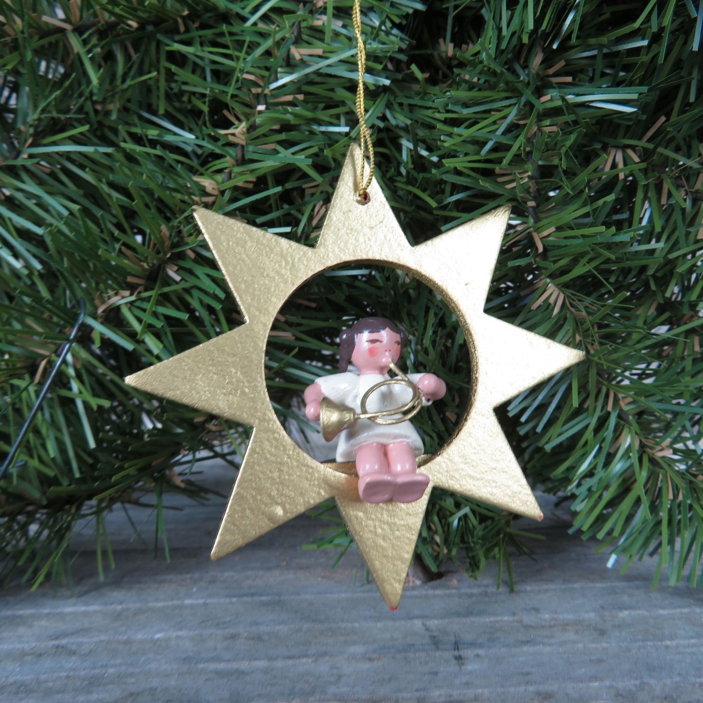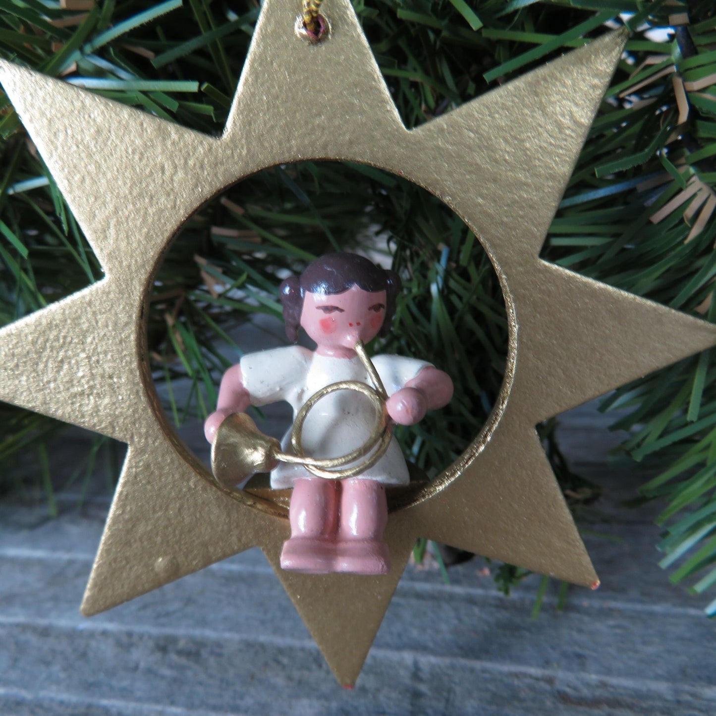 Vintage Angles on Gold Star Wood Ornament with French Horn Wooden Christmas
