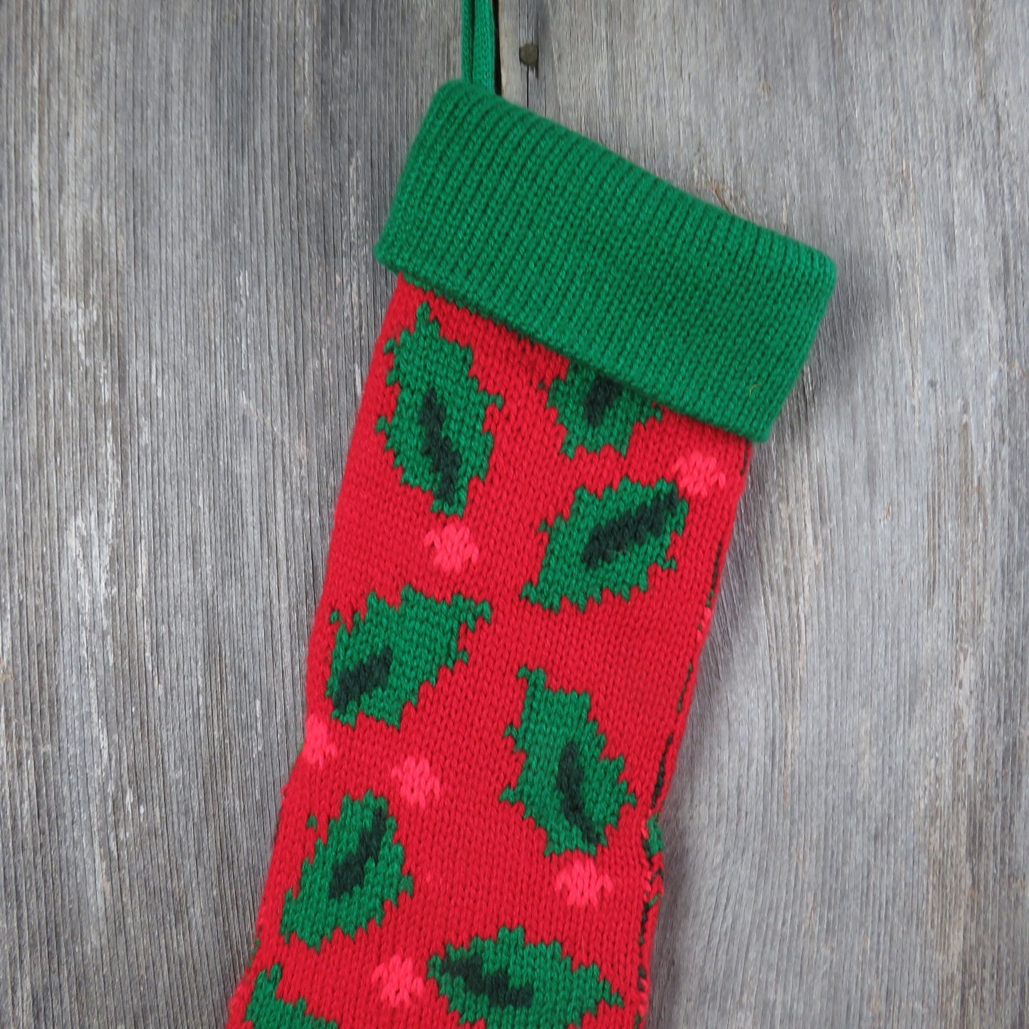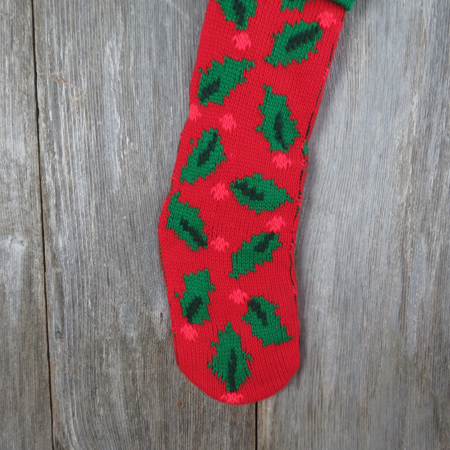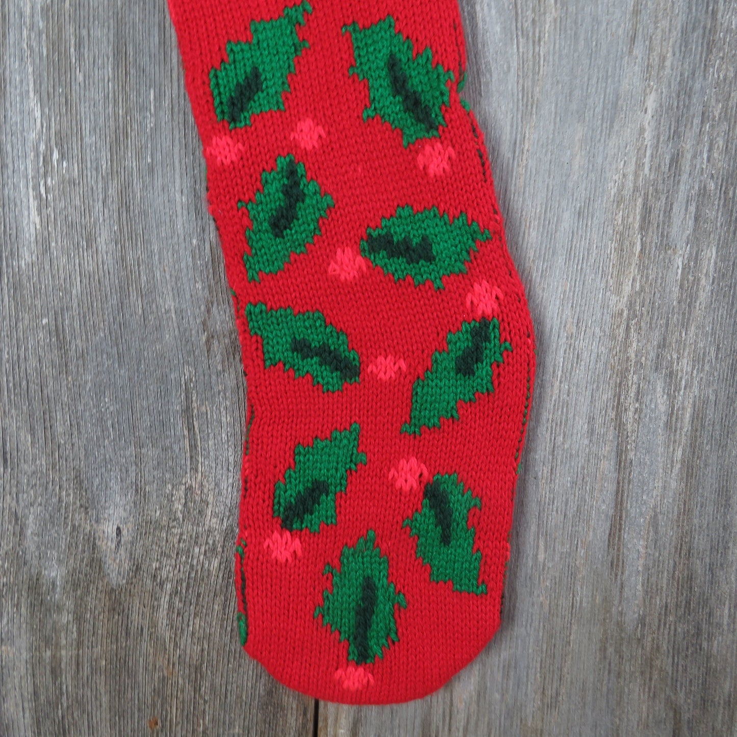 Vintage Knit Holly Leaf Stocking Hallmark Christmas Red Green Abstract Knitted Chunky 1994