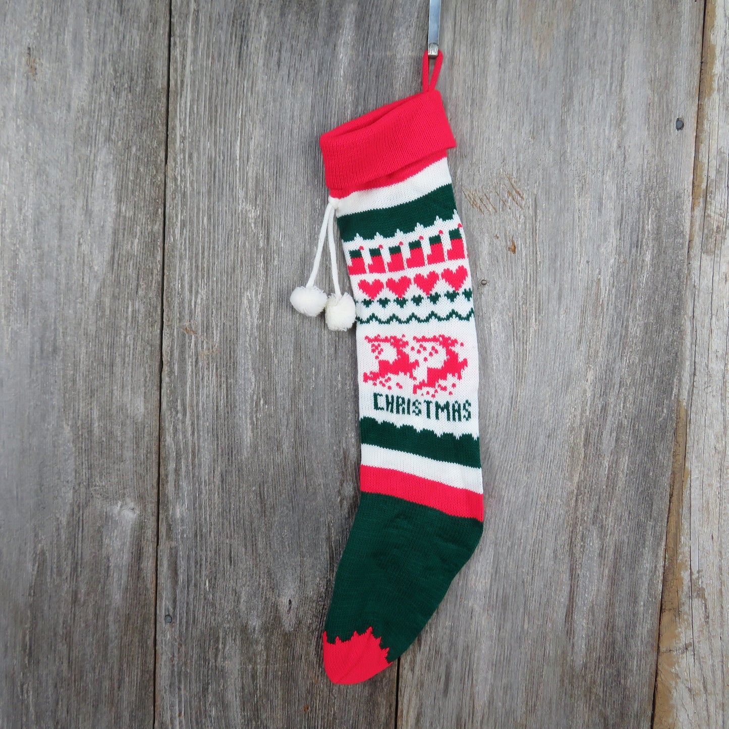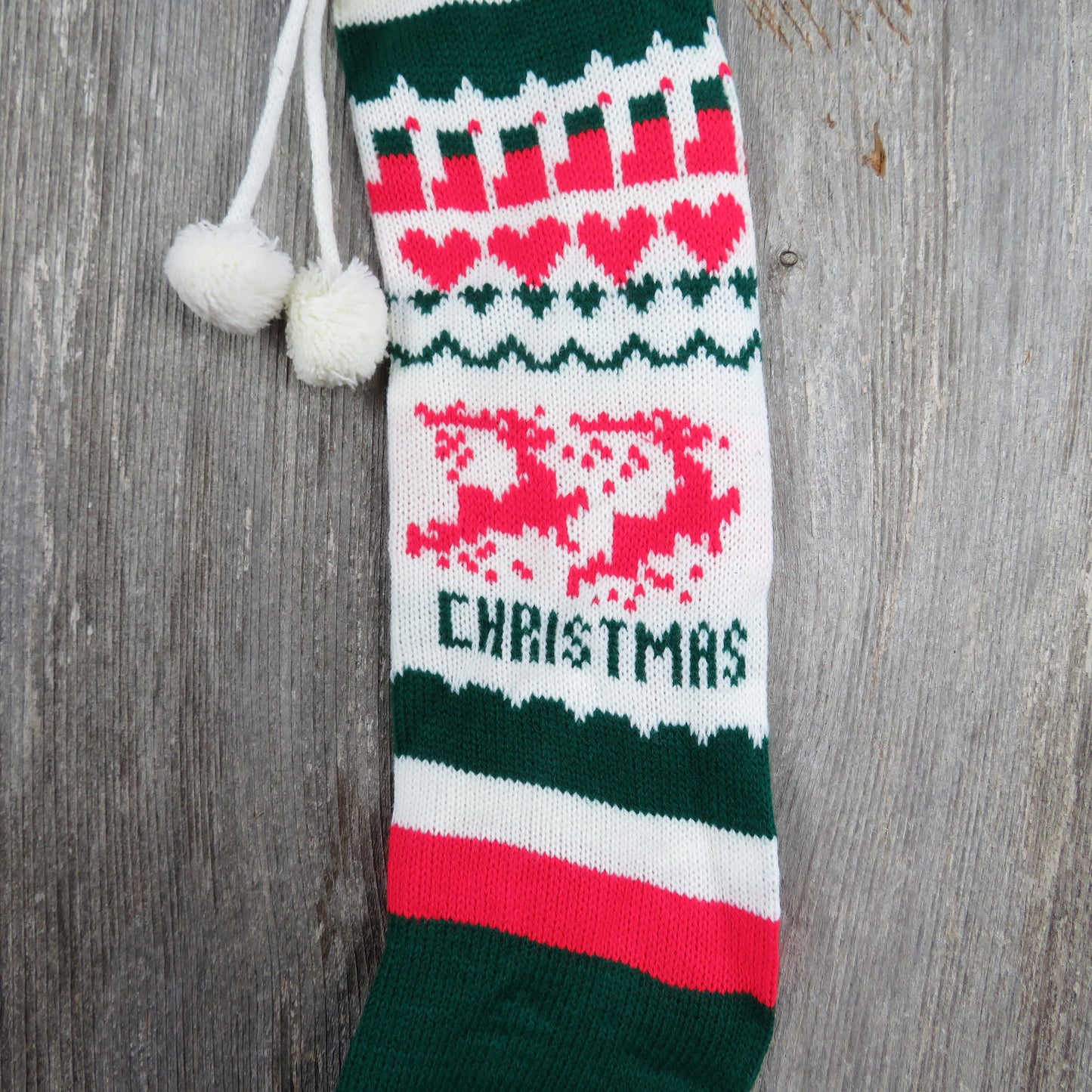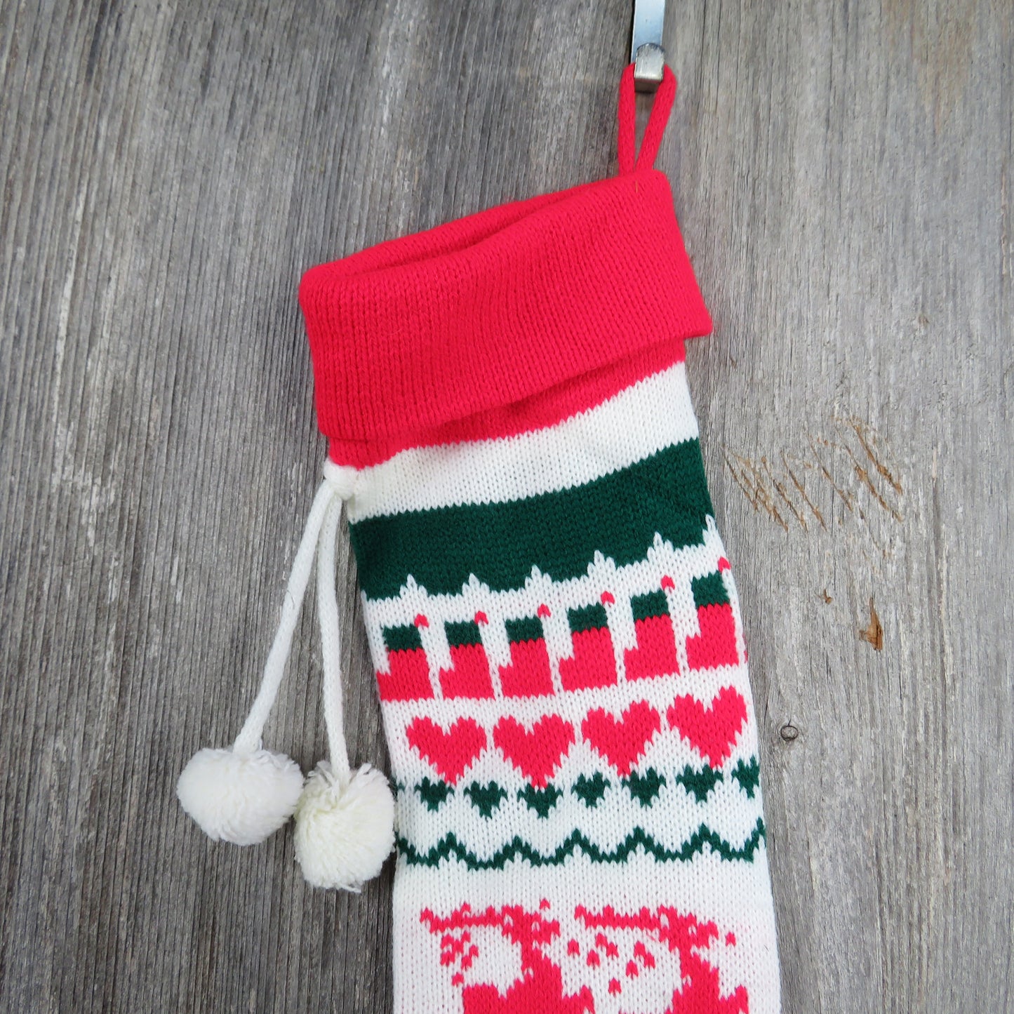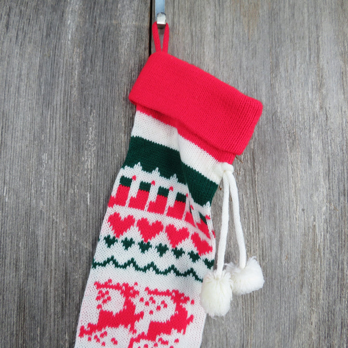 Vintage Knit Stocking Reindeer Hearts Stockings Christmas Deer Knitted Red Green White Pom Pom