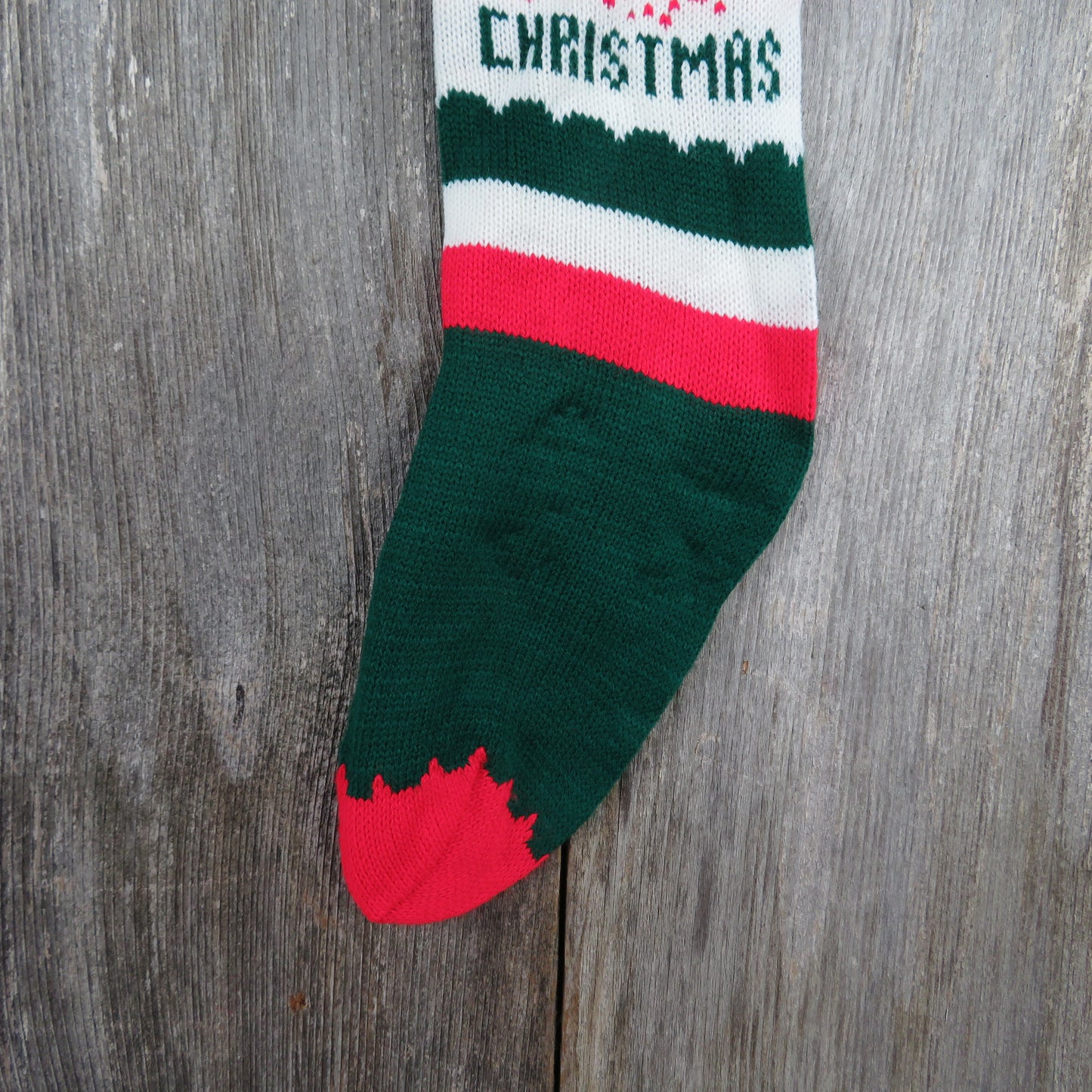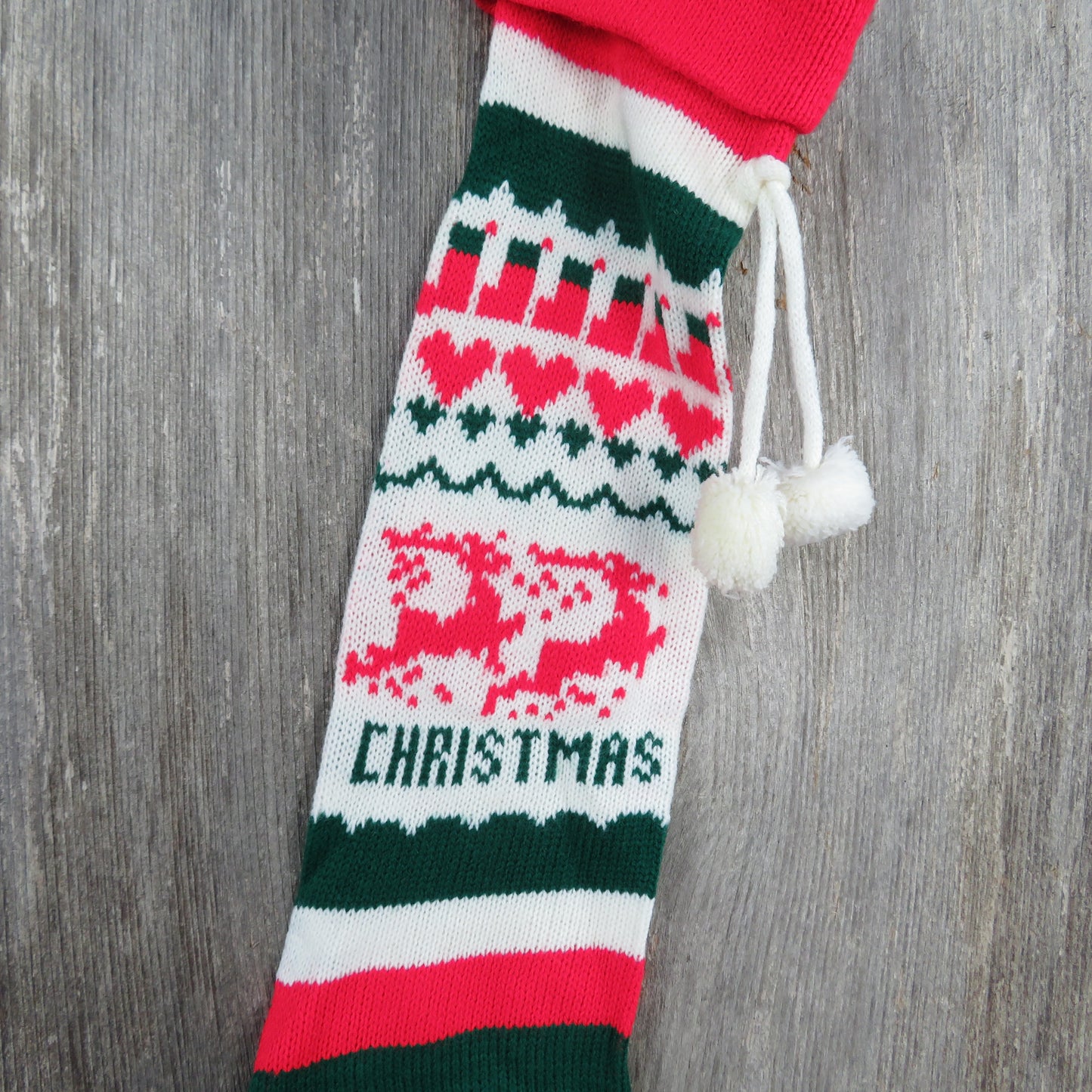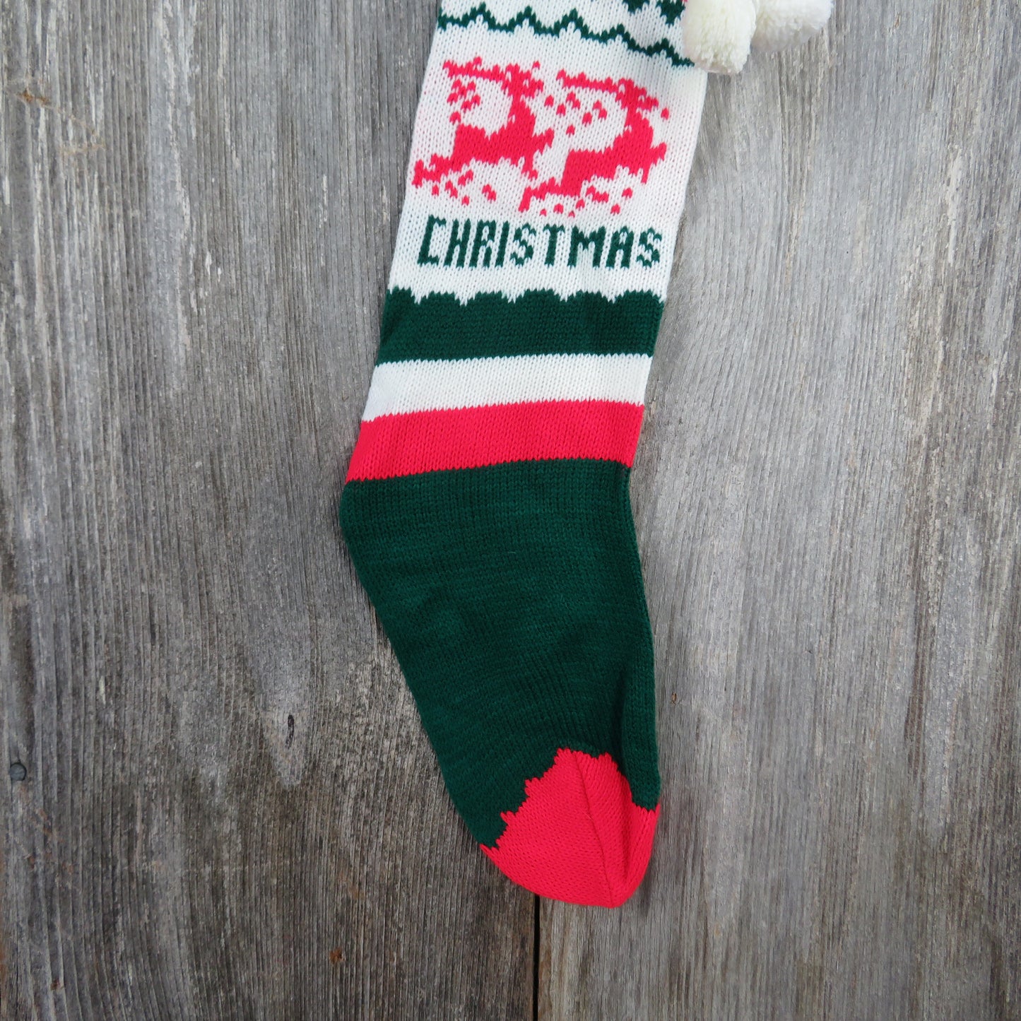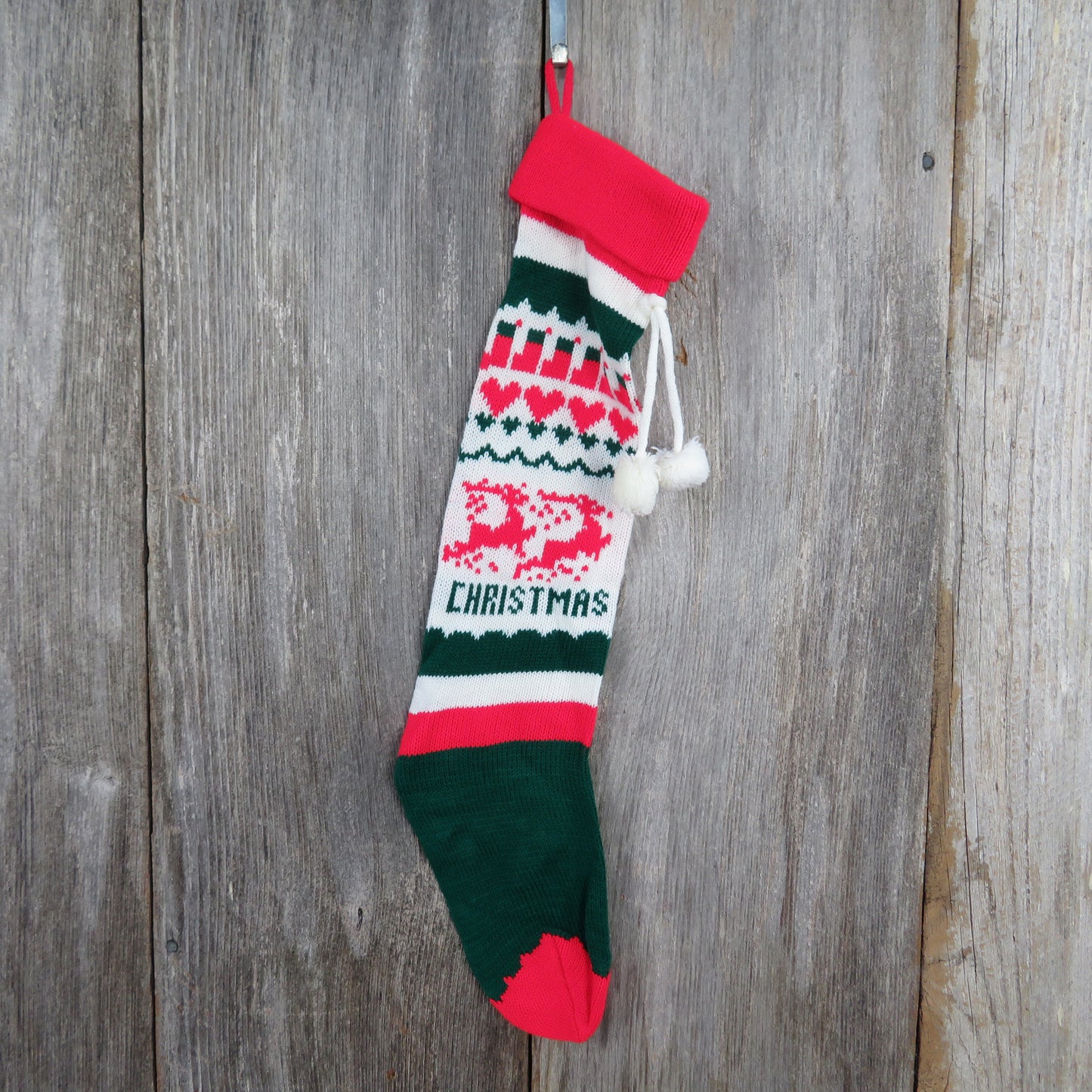 Vintage Knit Stocking Reindeer Hearts Stockings Christmas Deer Knitted Red Green White Pom Pom