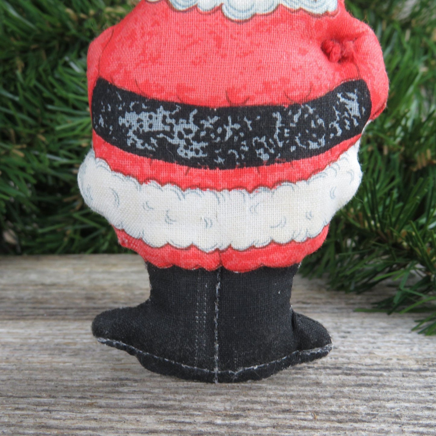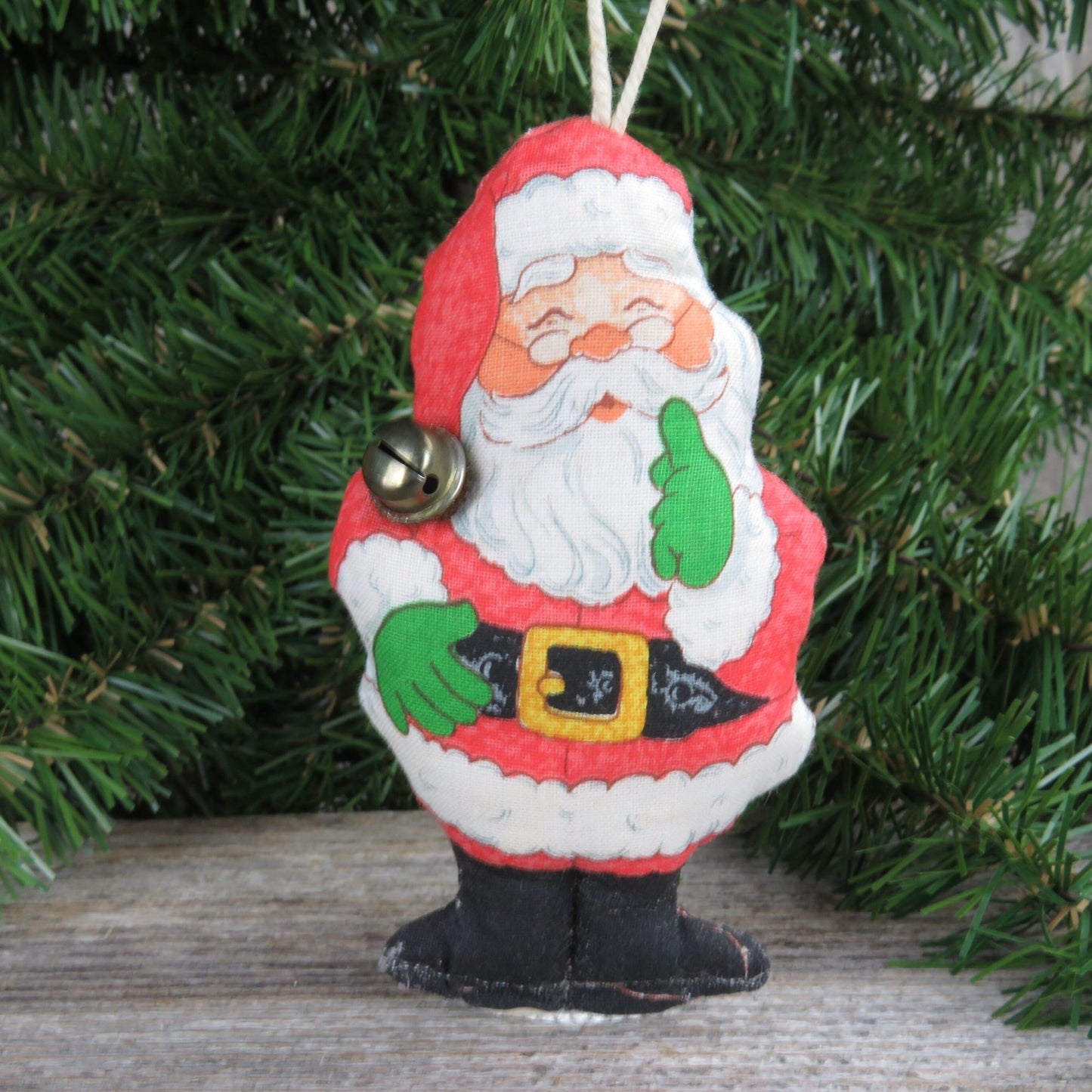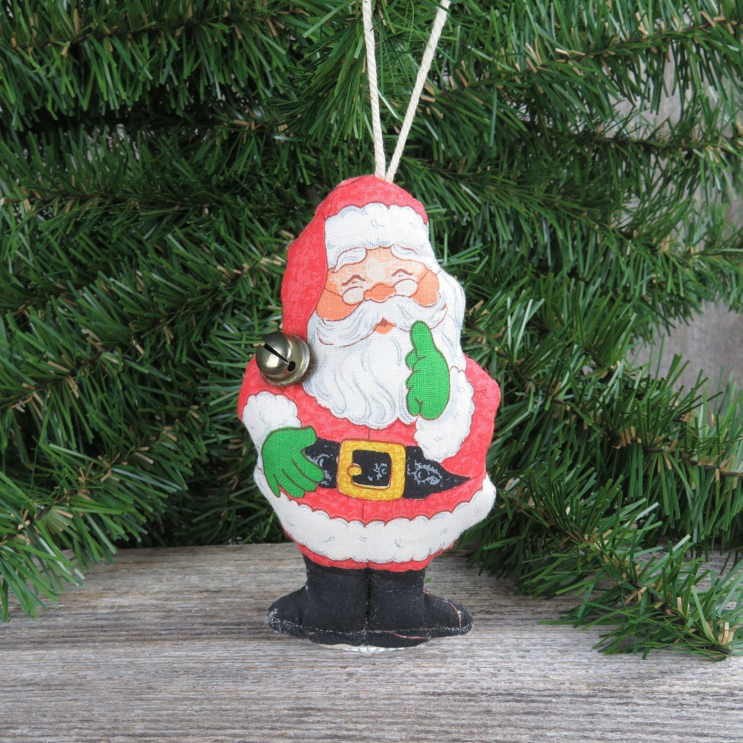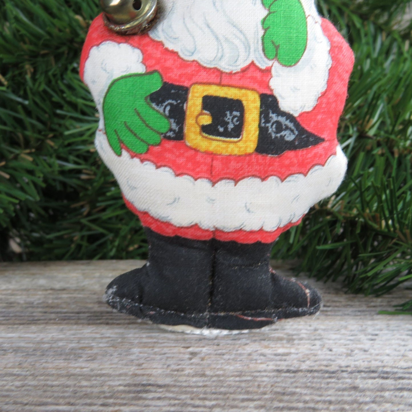 Vintage Santa Ornament Plush Body Fabric Bell Printed Red Green Christmas