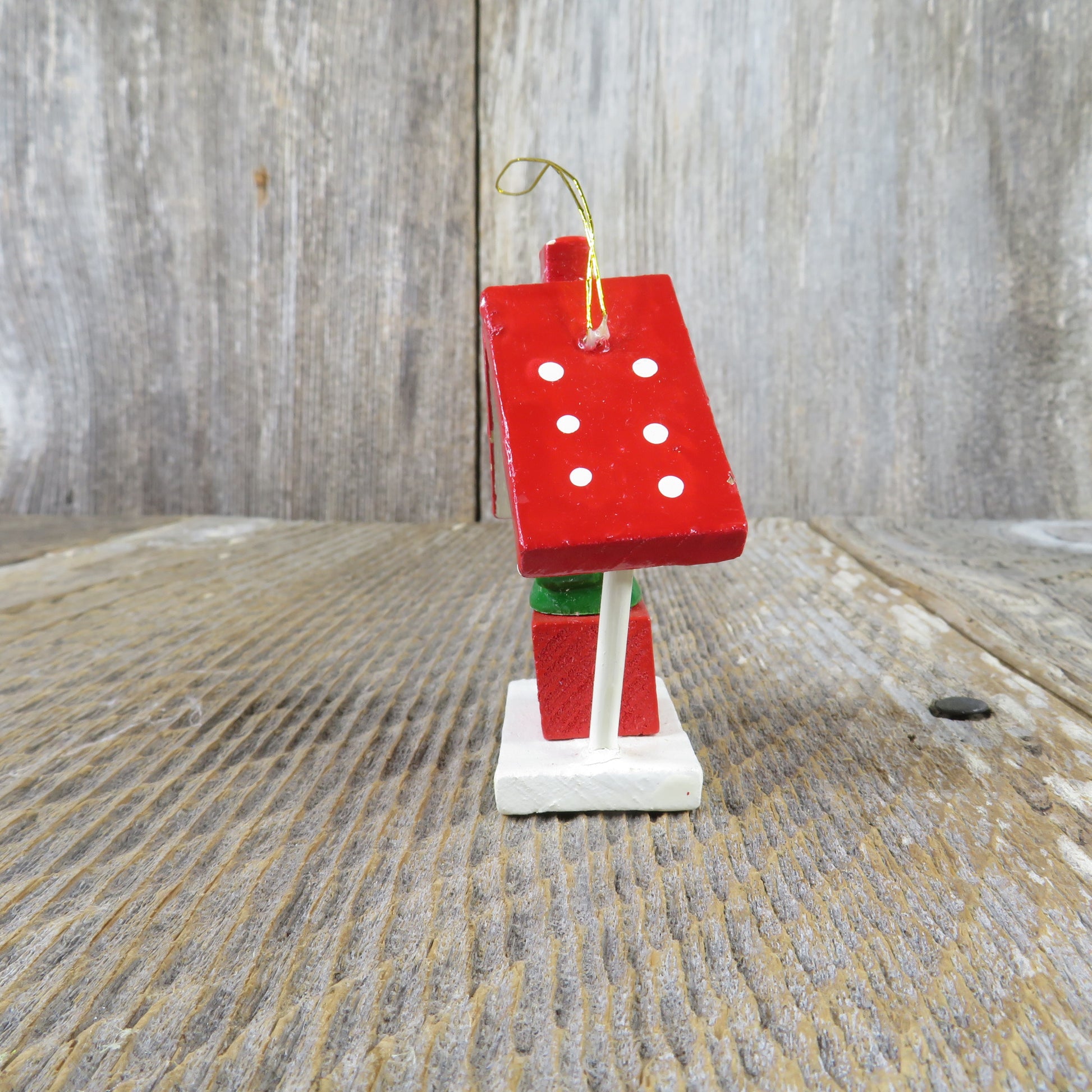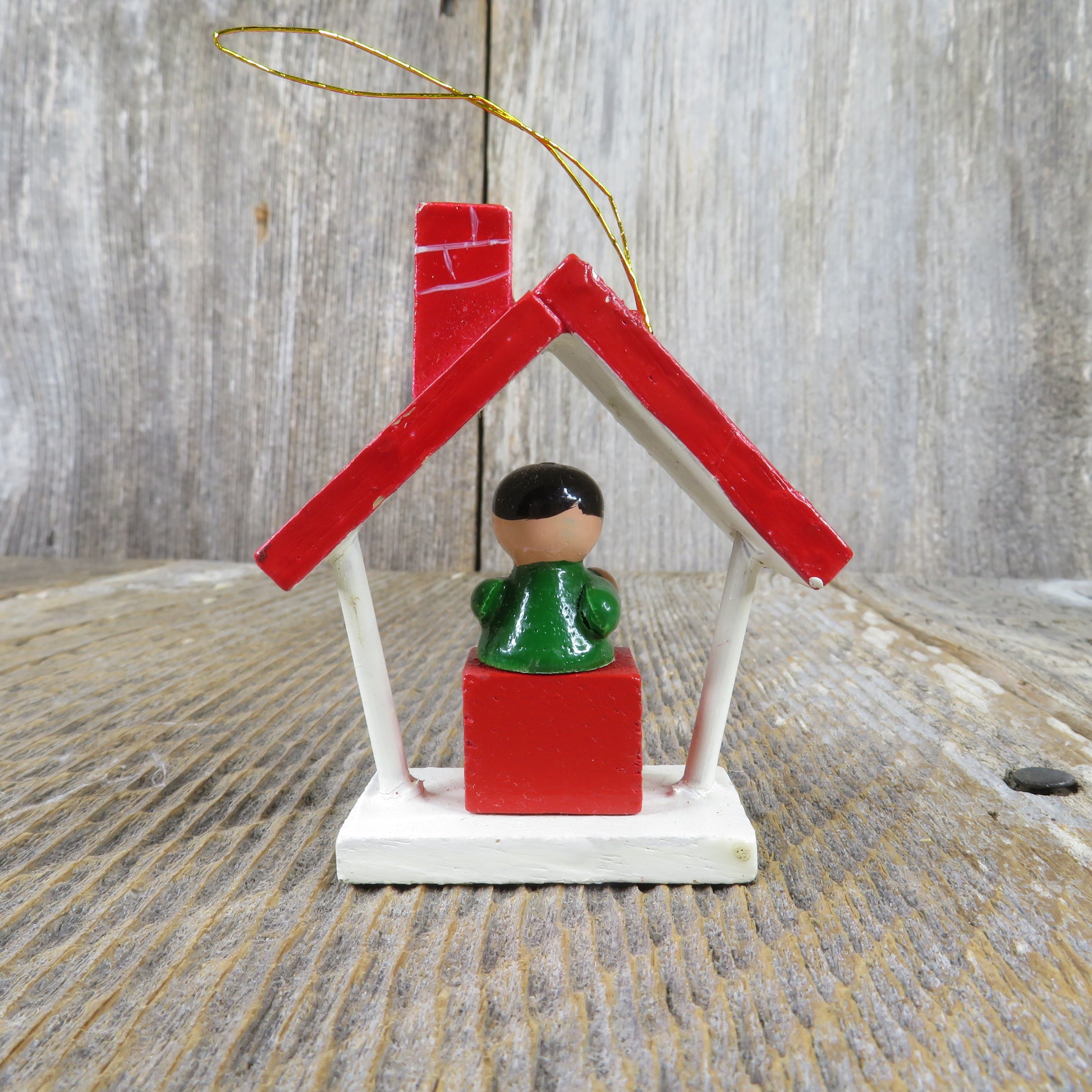 Vintage Wood Red House Ornament Boy on Block Roof and Chimney Christmas