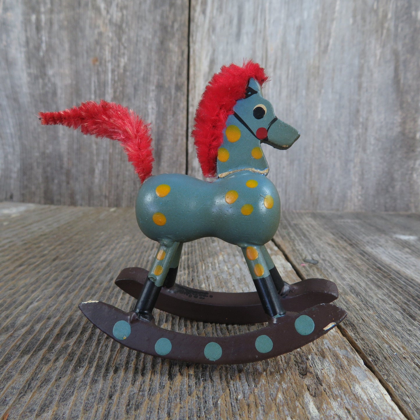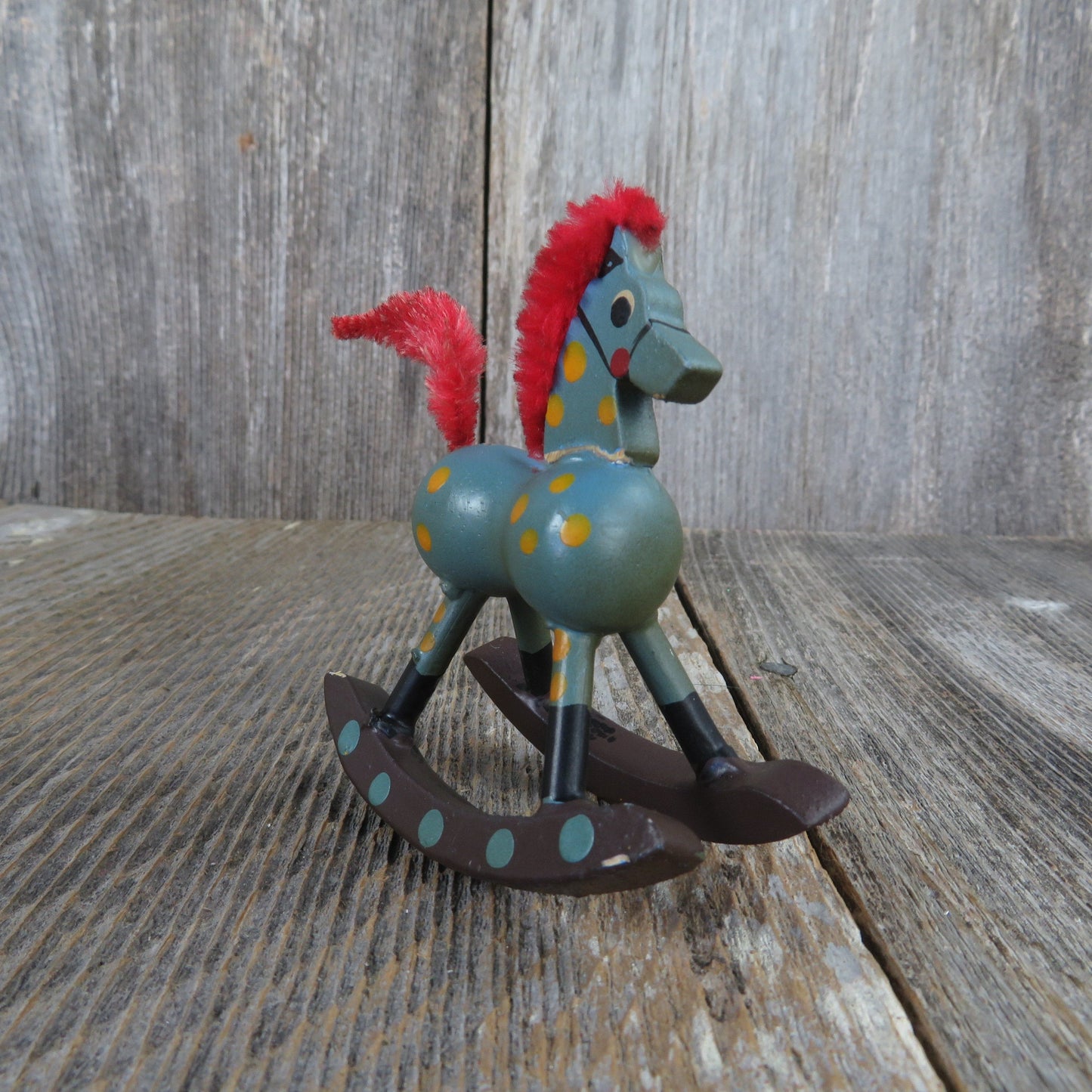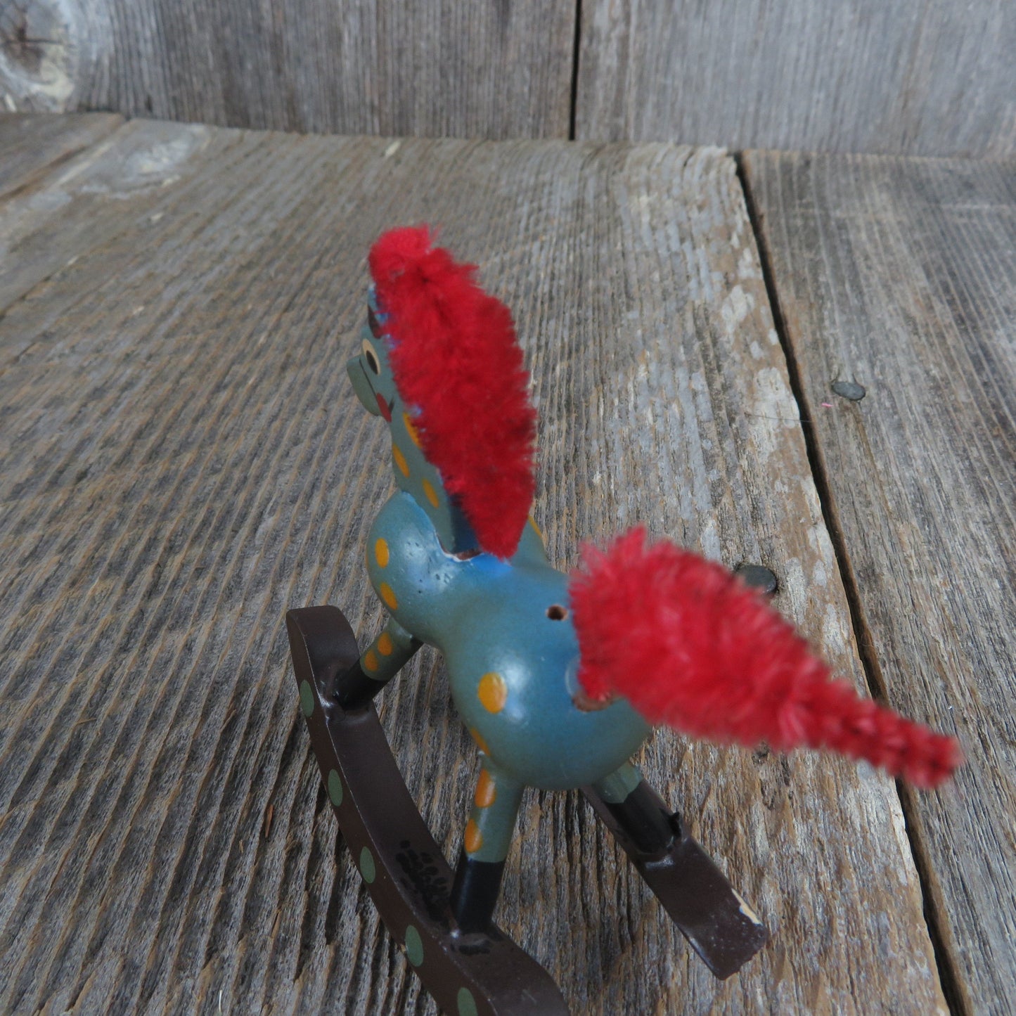 Vintage Wooden Blue Rocking Horse Pony Ornament Wood Christmas Red Pipe Cleaner Taiwan